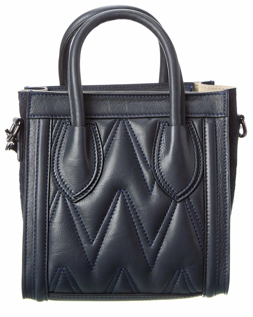 - Eva Diamond Leather Tote in midnight blue leather and suede and gunmetal-tone hardware with logo accent