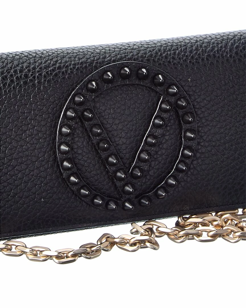 - Bianca Leather Wallet On Chain in black leather and gold-tone hardware with spiked logo and chain strap