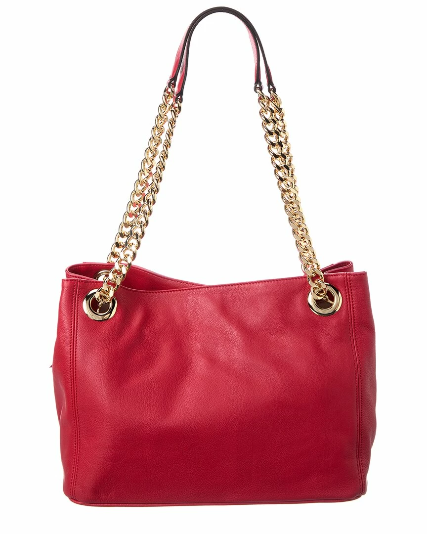 - Exterior design details: gold-tone hardware, embossed logo accent, removable tassel charm